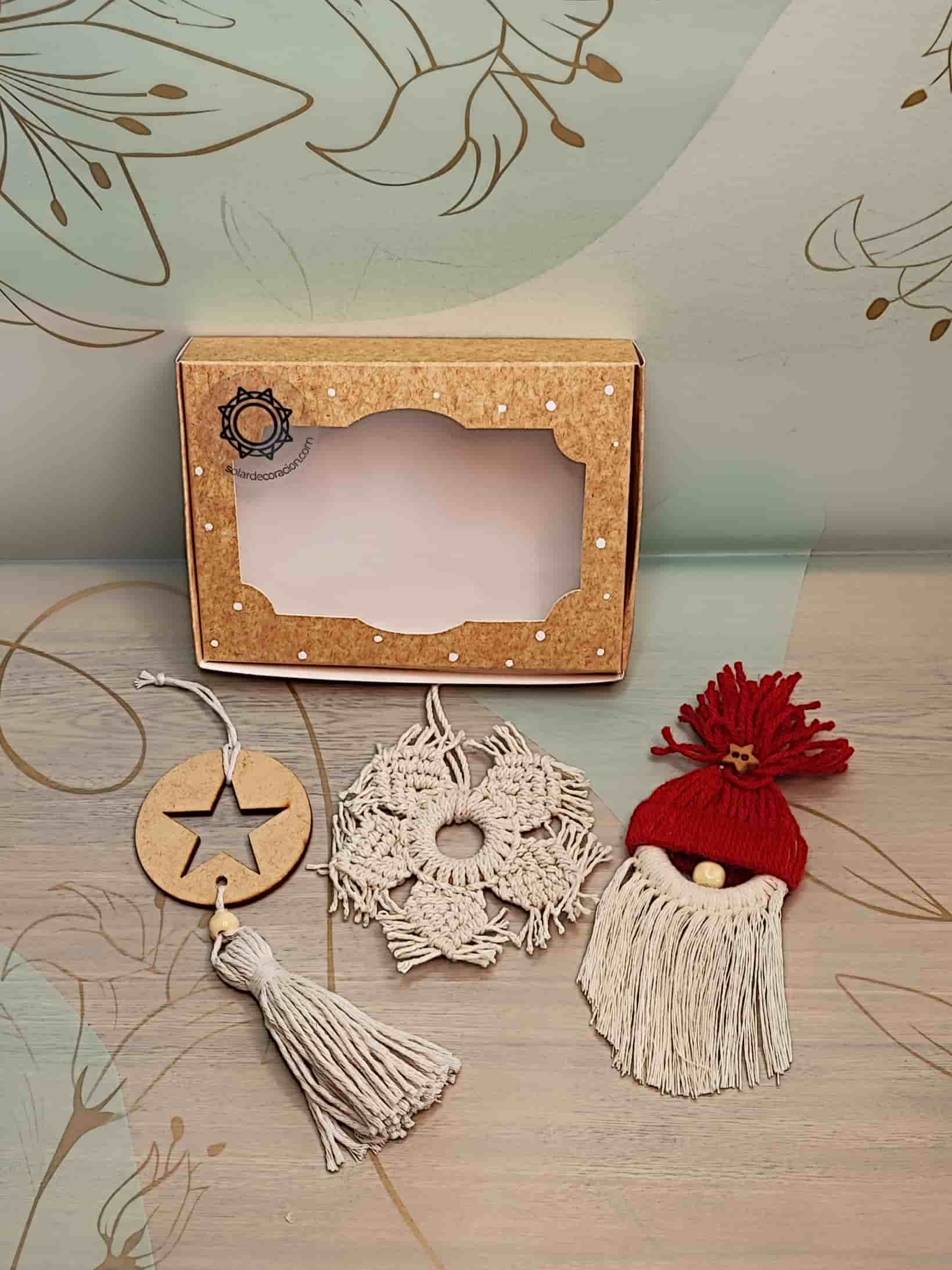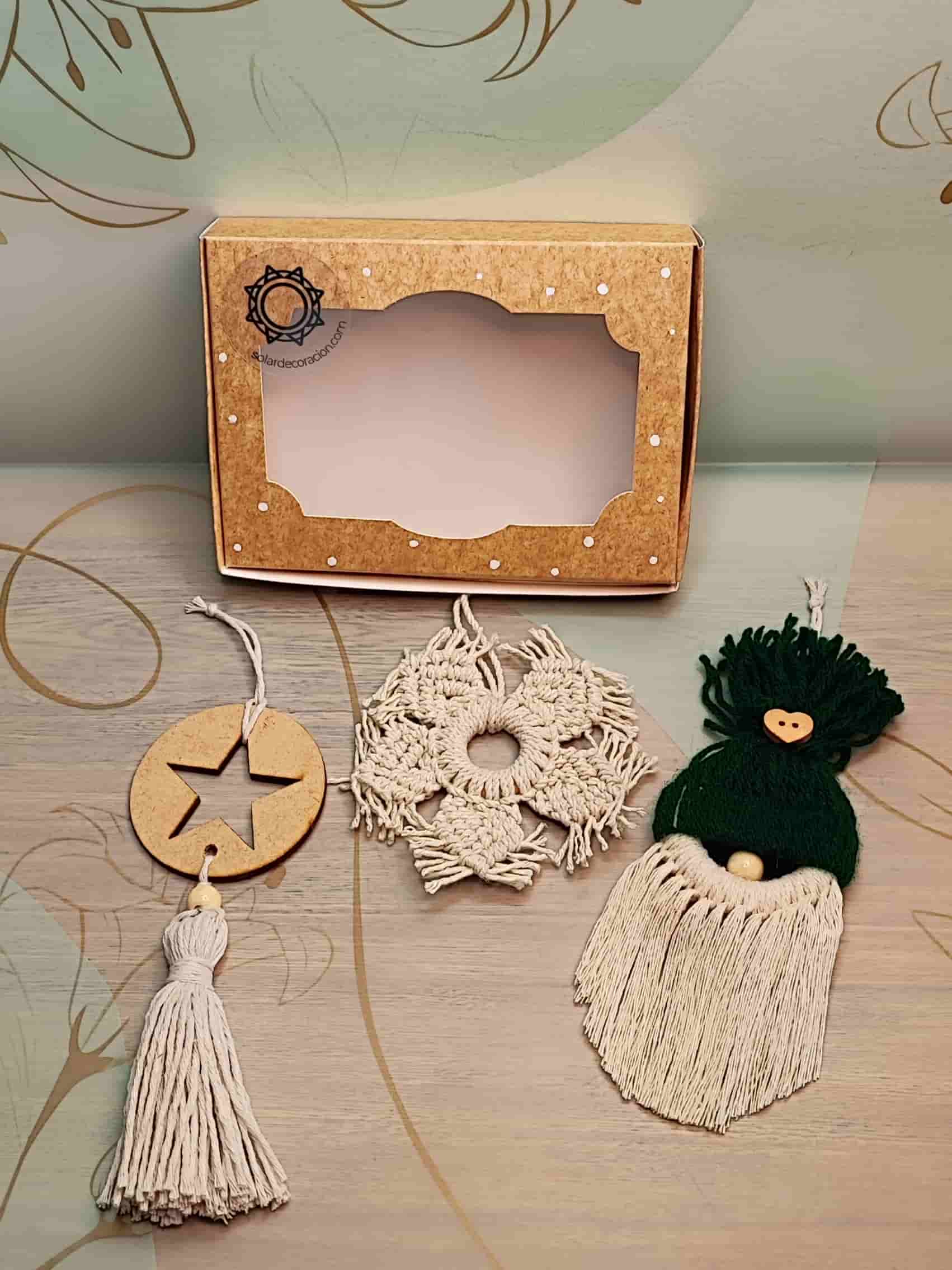 Este set incluye 3 adornos tejidos con diseños únicos: una ⭐ estrella con borla, un ❄️ copo de nieve y un 🎅 Papá Noel en macramé.