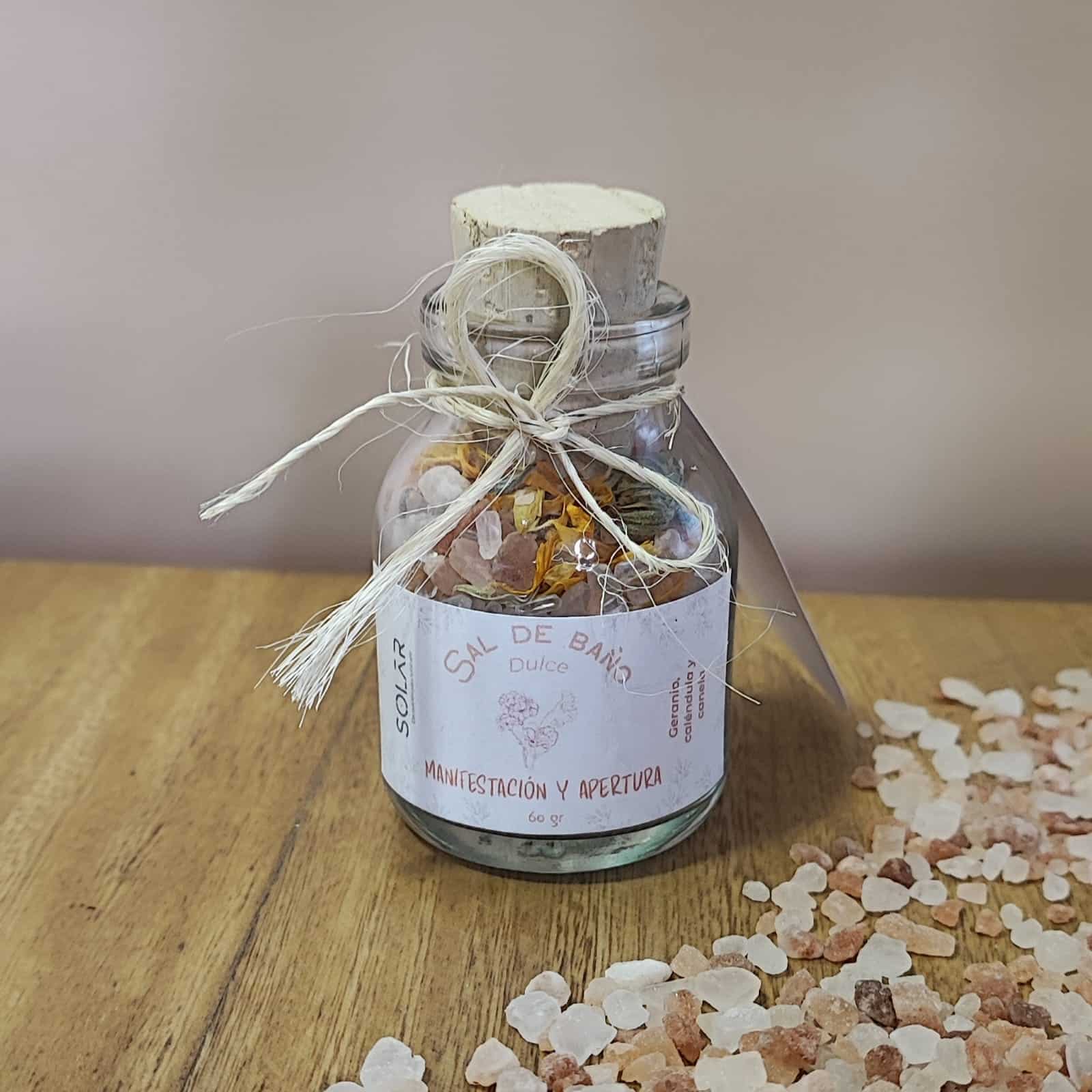 Sal de baño artesanal creada para rituales de manifestación, apertura energética y conexión con la intención. Elaborada con sal rosada del Himalaya, sal de Epsom, canela y caléndula, y aromatizada con aceite esencial de geranio, ideal para baños conscientes y rituales personales.