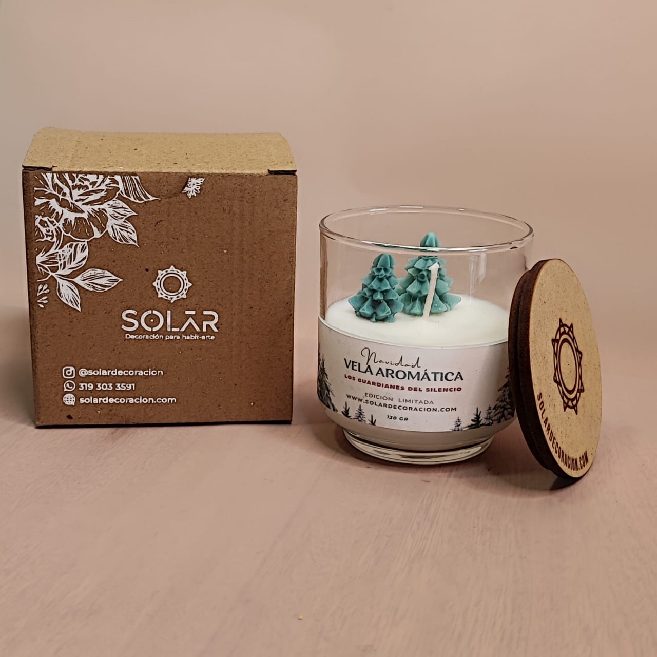 Elaborada artesanalmente, su decoración incluye dos delicados arbolitos de Navidad incrustados en la cera, evocando el espíritu navideño y el resguardo de la tranquilidad en tu hogar. Cada detalle ha sido pensado para ser más que una vela: es una obra que embellece y conecta con la esencia de estas fechas.